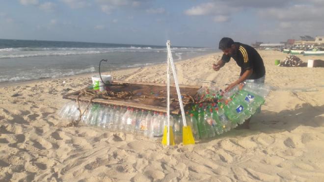على مدار أسابيع جمع "معاذ"، كما يتحدث لمراسل "وكالة قدس نت للأنباء"، نحو "700زجاجة فارغة"، وأحكم إلصاقها ببعضها البعض بشكلٍ مُحكم ومُتقن، بما لا يدع مجالاً أن تتحرك أو تتناثر عن بعضها بفعل أمواج البحر، وتكُن قادرة على حمله وأشقائه.