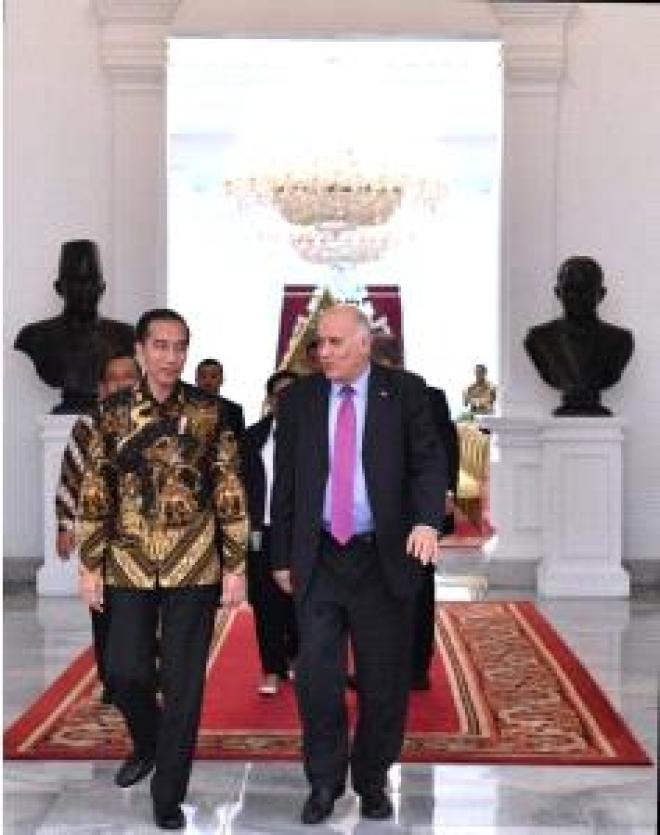 سلم أمين سر اللجنة المركزية لحركة فتح، رئيس اللجنة الأولمبية الفلسطينية، اللواء جبريل الجوب اليوم الثلاثاء، الرئيس الاندونيسي جوكو ويدودو رسالة من الرئيس الفلسطيني محمود عباس (أبو مازن)، بحضور سفير دولة فلسطين في إندونيسيا زهير الشن.