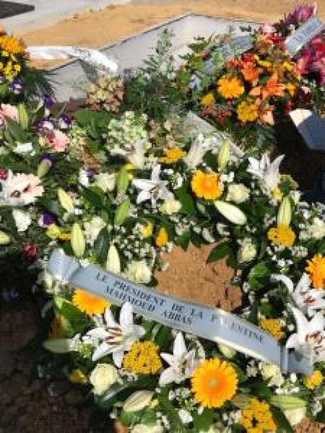 ووضعت أكاليل من الزهور باسم رئيس دولة فلسطين محمود عباس، ومؤسسة الشهيد ياسر عرفات، وعائلة الفقيد، على ضريحه، وبحضور طاقم سفارة فلسطين لدى فرنسا.