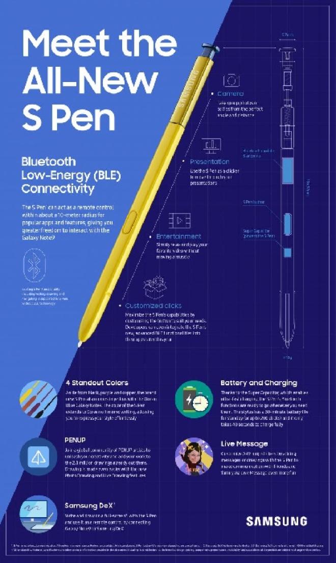 وتضمن تقنية BLE بقاءS Pen جاهز للاستخدام في أي وقت تحتاجه، مع إمكانية اقترانه مع هاتف Galaxy Note9 حين تتم إزالته والحفاظ على اتصال مستمر حتى وأن تم إيقاف تشغيل البلوتوث. ولا يحتاج موفر الطاقة فائق الأداء في القلم سوى إلى 40 ثانية للوصول إلى مستوى شحن كامل وليستمر في الأداء لمدة 30 دقيقة أو استخدامه لنحو 200 مرة.