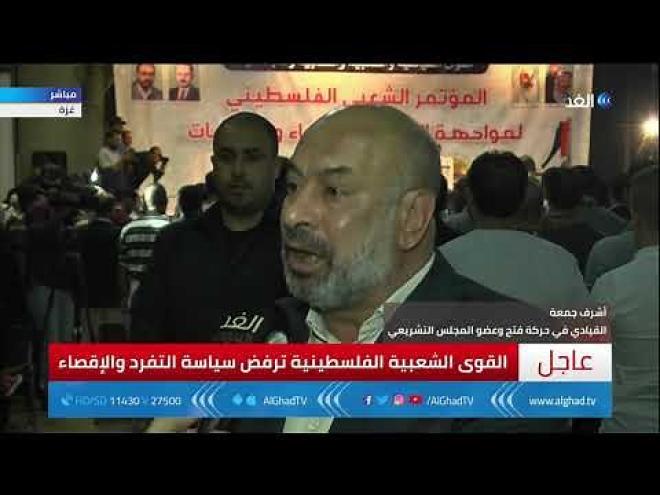 وأضاف جمعة في تصريحات لفضائية "الغد" الاخبارية، أن تلك الجماهير بحضورها الكبير تبعث برسائل عديدة للمجلس المركزي في حالة انعقاده، بأنها تأمل أن يكون المجلس "توافقي" و"توحيدي" وليس "اقصائياً" يتسم بالتفرد واتخاذ اجراءات قد لا تكون مقبولة، مشيرا إلى أن الحضور اليوم للمؤتمر يأملون في أعضاء المجلس المركزي بأن يمتازوا بالحكمة والعقلانية السياسية وألا يتخذوا اجرءات أخرى ضد غزة وأن يتوقف كل اجراء تم اتخاذه سابقاً.