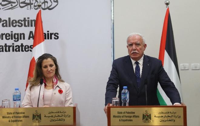 وأضاف المالكي في مؤتمر صحفي جمعه بوزيرة خارجية كندا كريستيا فريلاند، أعقب اجتماع ثنائي مطول في مقر الوزارة بمدينة رام الله، أن الاجتماع تناول تفاصيل حول القضايا المرتبطة بالاحتلال وتواصل الانتهاكات الإسرائيلية على الأرض، والاستيطان وقضية الخان الأحمر، والإجراءات الاحتلالية في القدس، والقرارات العنصرية الصادرة عن "الكنيست" الإسرائيلي والإجراءات الأميركية الأخيرة من نقل للسفارة إلى القدس، وقطع المساعدات وما تسمى صفقة القرن، والتعقيدات التي يشهدها الوضع في فلسطين وما نحن مقدمون عليه.