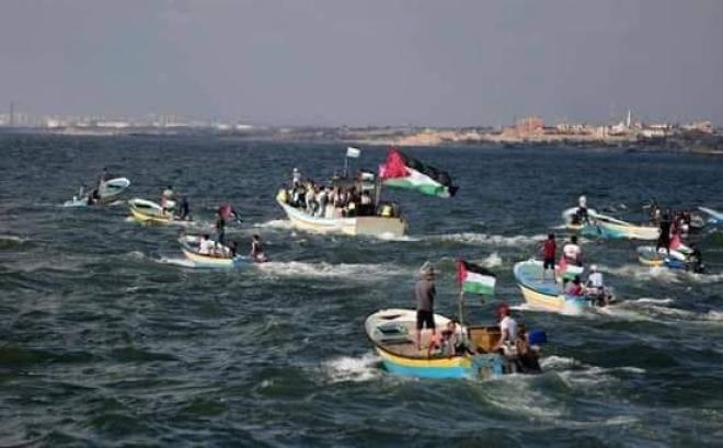 وشارك قرابة 30 قاربا يرفعون الاعلام الفلسطينية بفعاليات المسيرة البحرية، بالاضافة مئات المتظاهرين المساندين قرب الحدود المائية شمال غرب بيت لاهيا.