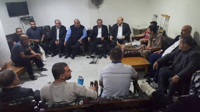 وضم الوفد موسى أبو مرزوق، و حسام بدران، وزاهر جبارين، وصلاح البردويل، وزكريا أبو معمر، فيما كان في استقبالهم إدارة المستشفى وممثلو الجرحى.