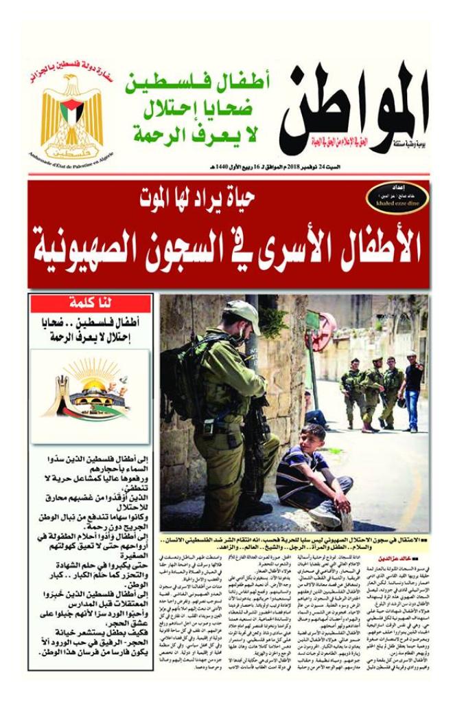اصدرت جريدة الموطن الجزائرية بالتنسيق والتعاون مع سفارة دولة فلسطين بالجزائر ،ملحق خاص بمناسبة يوم الطفولة الفلسطيني، وأفاد مسئول ملف الاسرى فى سفارة دولة فلسطين بالجزائر الاسير المحرر خالد صالح (عزالدين) بان هذا الملحق تم صدوره بشكل خاص بمناسبة "يوم الطفل العالمي" ويركز على ممارسات الاحتلال الاسرائيلي بحق الاسرى الاطفال في سجون الاحتلال والجرائم المنظمة التى يرتكبها الاحتلال الاسرائيلي بحقهم ، وقد شارك العديد من الكتاب والإعلاميين في فلسطين وخارجها بالمشاركة فى الكتابة بالملحق الذي احتوى علي العديد من الاخبار والمقالات والتقارير الاعلامية الخاصة حول الطفولة في فلسطين .