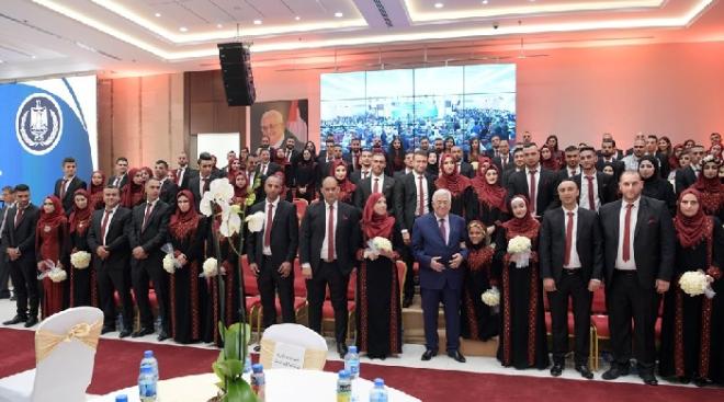 والتقط أبو مازن صورة جماعية مع العرسان، وبارك لهم زفافهم، وهنأهم وذويهم بهذه المناسبة.