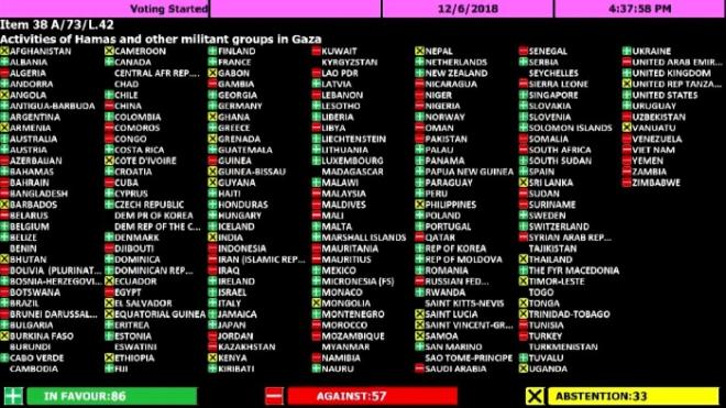 وأيّدت مشروع القرار الأميركي 87 دولة وعارضته 57 دولة بينما امتنعت 33 دولة عن التصويت.