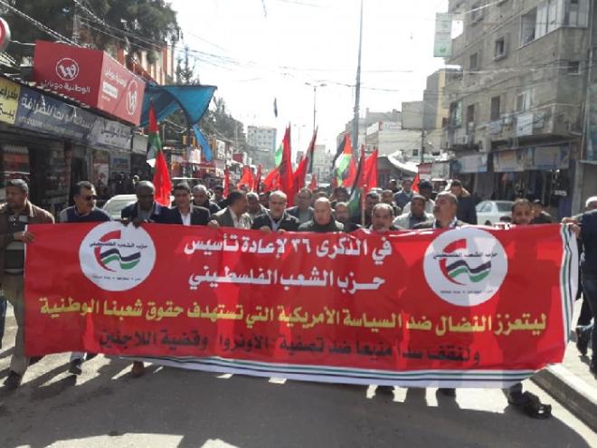 وأكد الحزب الى أن " الإسراع في إنهاء الانقسام وإنجاز المصالحة يمثل الطريق الأصوب للحفاظ على الحقوق المشروعة لشعبنا الفلسطيني في مواجهة كافة محاولات التصفية التي تستهدف قضيتنا الوطنية وفِي مقدمتها ما يسمى بصفقة القرن بكافة اشكالها ومسمياتها ،  كما دعا الحزب منظمة التحرير الفلسطينية لاستنهاض دورها في كافة المحافل المحلية والعربية والدولية"،  مشددا على أهمية   استحضار دروس الانتفاضة الشعبية الكبرى والتعلم منهما  بتجسيد الوحدة الوطنية والاعتماد على الشعب في مواجهة العدوان ومخططات التصفية، داعيا لتشكيل جبهة موحدة للمقاومة الشعبية تعمل وفق استراتيجية موحدة لمواجهة المخاطر المحدقة بقضيتنا.
