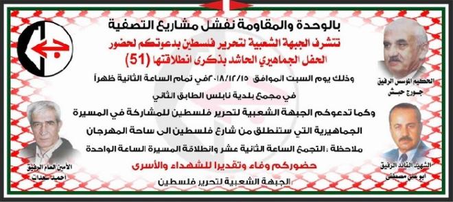 دعت الجبهة الشعبية لتحرير فلسطين جماهير الشعب الفلسطيني إلى المشاركة بمهرجان "الوحدة والمقاومة" بذكرى انطلاقتها الـ51، وذلك يوم السبت الموافق 15/12/2018 في تمام الساعة الثانية ظهراً في مجمع بلدية نابلس الطابق الثاني.