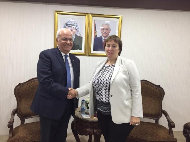 جاء ذلك خلال لقاء عريقات مع المبعوث الأوروبي لعملية السلام سوزان ترستال، وممثل الاتحاد الأوروبي في فلسطين، وعدد من المستشارين، ومدير عام وزارة الخارجية البريطانية للشؤون السياسية، يرافقه القنصل البريطاني العام فيليب هول، وعدد من المساعدين كل على حدة.