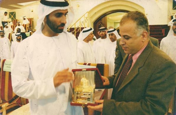صورة من الأرشيف: الصحفي روحي درابيه يقدم درعاً تذكاريا لسمو الشيخ سعيد بن زايد على مواقفه الداعمة والمشرفة للرياضة الفلسطينية