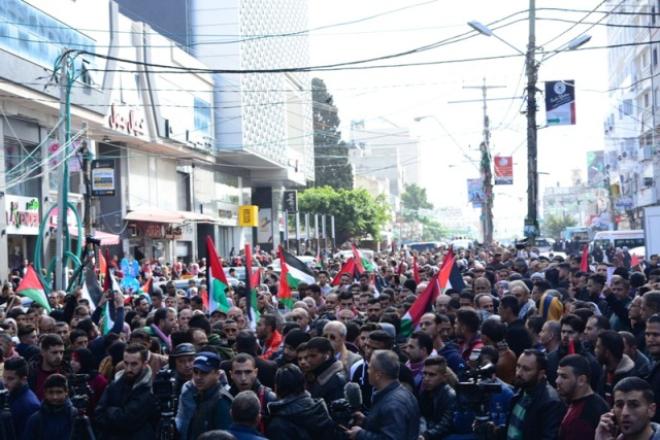 وحمل المشاركون في مسيرة جماهيرية حاشدة وسط مدينة غزة، الأعلام الفلسطينية وسط هتافات تدعو لإسقاط الانقسام واستعادة الوحدة الوطنية، وتعزيز صمود الشعب الفلسطيني لمواجهة المخاطر التي تواجه القضية والحقوق الوطنية الفلسطينية وفي مقدمتها، وقف التطبيع السري والعلني مع دولة الاحتلال الإسرائيلي ومجابهة "صفقة العصر".