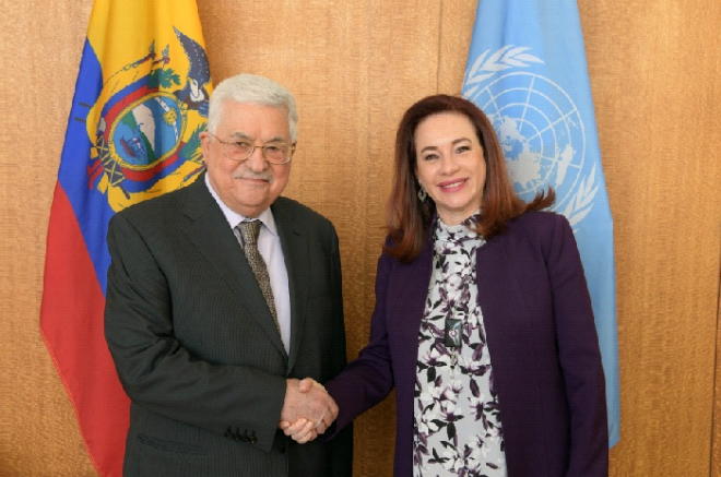 التقى الرئيس الفلسطيني محمود عباس(أبو مازن)، اليوم الاثنين، في نيويورك، رئيسة الجمعية العامة للأمم المتحدة ماريا فرناندا إسبينوزا.