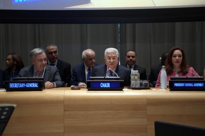 أكد الرئيس الفلسطيني محمود عباس (أبو مازن) على التزام دولة فلسطين بالقانون الدولي والشرعية الدولية، وحل الصراع سلمياً، وصولاً إلى إنهاء الاحتلال وتحقيق استقلال دولة فلسطين، بعاصمتها القدس الشرقية لتعيش بأمن وسلام على حدود العام 1967، إلى جانب دولة إسرائيل، وحل قضايا الوضع النهائي كافة، وعلى رأسها مسألة اللاجئين والأسرى استناداً لقرارات الشرعية الدولية ذات الصلة، ومبادرة السلام العربية لعام 2002.