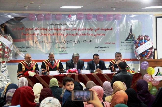 بحضور الدكتور كمال العبد الشرافي رئيس جامعة الأقصى ونائب رئيس الجامعة لشئون الدراسات العليا والبحث العلمي أ.د محمد سلمان، منحت شئون الدراسات العليا والبحث العلمي بجامعة الأقصى درجة الماجستير للباحثة راوية شعبان حسن صباح ،من كلية التربية تخصص: أصول تربية ـ إدارة تربوية، وذلك بعد مناقشة رسالتها المعنونة: