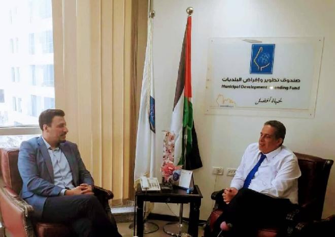 بحث المدير التنفيذي للصندوق الفلسطيني للتشغيل والحماية الاجتماعية للعمال مهدي حمدان مع المدير العام لصندوق اقراض البلديات الدكتور توفيق البديري سبل التعاون المشترك وفتح افاق العمل بين المؤسستين.