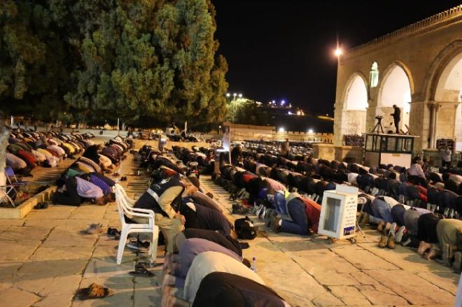 أدى عشرات آلاف الفلسطينيين من القدس المحتلة وخارجها، الليلة، صلاتي العشاء و"التراويح" في رحاب المسجد الأقصى المبارك.