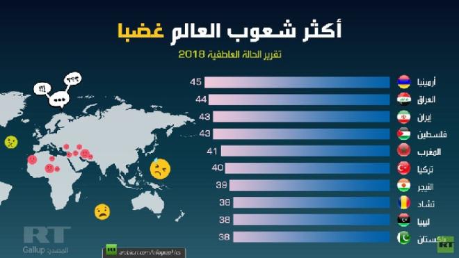 وللأسف فقد كان للدول العربية نصيب في قائمة الدول التي اختبرت أقل كم من المشاعر الإيجابية عالميا، فقد عبرت نسبة كبيرة من العراقيين المشمولين بالاستبيان عن اختبارهم لمشاعر غضب ليأتوا في المرتبة الثانية عالميا والأولى عربيا في هذا السياق. كما شملت القائمة فلسطين والمغرب وليبيا.
