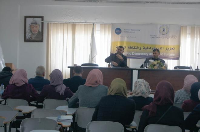 نظم مركز إعلام حقوق الإنسان والديمقراطية " شمس" ورشة عمل حول حقوق المرأة بين الشريعة الإسلامية والمواثيق الدولية، حضرها مجموعة من طلبة كلية الفقه والقانون في جامعة فلسطين الأهلية في بيت لحم ، وتأتي هذه الورشة ضمن مشروع تعزيز الثقافة المدنية لطلبة الشريعة في محافظات الضفة الذي ينفذه المركز بالتعاون مع الصندوق الوطني للديمقراطية (NED).