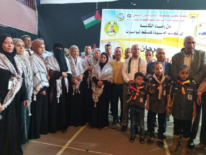 أقامت اللجنة الوطنية العليا لإحياء ذكرى 71 بمحافظة خان يونس مهرجان جماهيري حاشد يوم الخميسفى قاعة الهلال الاحمر الفلسطينى بخان يونس ، إحياء لذكرى النكبة 71 بحضور عضو اللجنة التنفيذية لمنظمة التحرير الفلسطينية رئيس دائرة شؤون اللاجئين د. احمد ابو هولى ،و محافظ محافظة خان يونس د. أحمد الشيبى ، ومدير عام المخيمات بدائرة شؤون اللاجئين عدنان منصور ، أعضاء المجلس الثورى لحركة فتح إياد صافى ، إياد نصر ورئيس اللجنة الشعبية للاجئين بمخيم خان يونس د.مازن أبوزيد وأعضاء اللجنة ، امين حركة فتح بإقليم غرب خانيونس وليد شقورة وعدد من مسؤولى الفصائل والشخصيات الاعتبارية بالمحافظة والوجهاء والمخاتير .