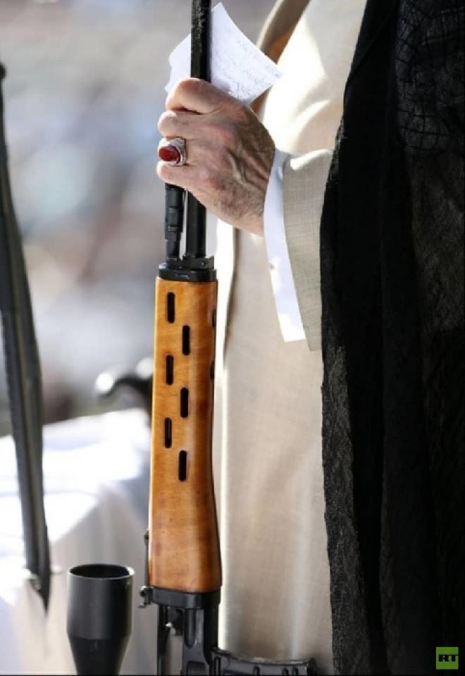 ظهر المرشد الأعلى الإيراني، علي خامنئي أثناء إلقائه خطبة صلاة عيد الفطر، اليوم الأربعاء ممسكا بقطعة سلاح، فيما أكدت وكالة "فارس" أن المرشد كان يحمل بندقية قنص روسية "دراغانوف".