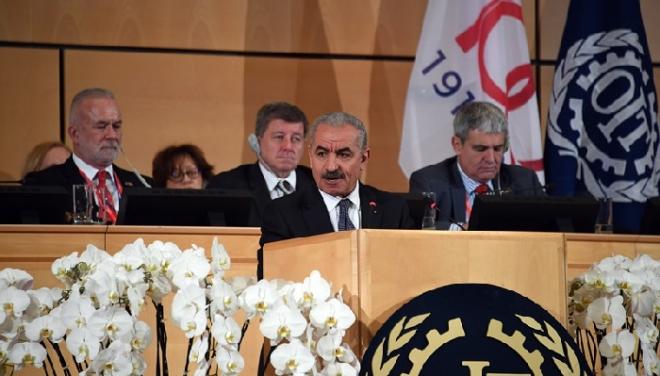 قال رئيس الوزراء الفلسطيني د. محمد اشتية: "تأمل فلسطين من منظمة العمل الدولية أن تتابع أوضاع العمال الفلسطينيين في سوق العمل الإسرائيلي ومتابعة القضايا المتعلقة بحقوقهم وتعويضاتهم، لأن إسرائيل تُخل بذلك، وتنفق بعض حقوق العمّال على بناء حواجز عسكرية على المعابر أقل ما يقال عنها أنها عنوان إذلال وإهانة. اضافة إلى الاقتطاعات من رواتبهم والتي تصل ثلث الراتب ولا يستفيد منها العمال شيئا يذكر".