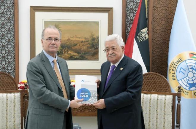 تسلّم الرئيس الفلسطيني محمود عباس، التقرير السنوي لصندوق الاستثمار الفلسطيني للعام 2018، خلال استقبال سيادته، أمس الثلاثاء، في مقر الرئاسة بمدينة رام الله، أعضاء الهيئة العامة ومجلس إدارة الصندوق وإدارته التنفيذية برئاسة رئيس مجلس الإدارة محمد مصطفى.