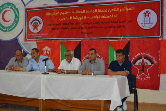 عقدت كتلة الوحدة العمالية، الإطار العمالي للجبهة الديمقراطية لتحرير فلسطين، مؤتمرها الثامن في قاعة الهلال الأحمر بمدينة غزة، تحت عنوان "لا لصفقة ترامب، لا لورشة البحرين" بحضور صف واسع من ممثلي الكتل والاتحادات العمالية  والاتحاد العام لنقابات عمال فلسطين ، والفعاليات الوطنية والاجتماعية ، والمندوبين المنتخبين من مؤتمرات المحافظات بقطاع غزة ، وبمشاركة أعضاء المكتب السياسي للجبهة الديمقراطية صالح ناصر "أمين الإقليم" ،وطلال أبوظريفة، وعددٍ من أعضاء اللجنة المركزية والقيادة المركزية للجبهة الديمقراطية.