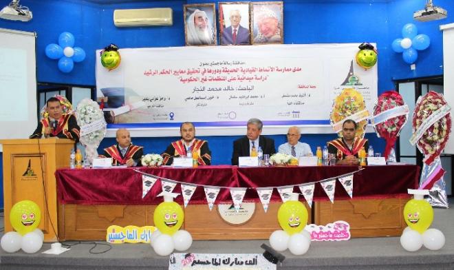 ناقشت جامعة الأقصى أول رسالة ماجستير في برنامج القيادة والإدارة للباحث خالد محمد النجار، وتحمل عنوان "مدى ممارسة الأنماط القيادية الحديثة ودورها في تحقيق معايير الحكم الرشيد" دراسة ميدانية على المنظمات غير الحكومية".
