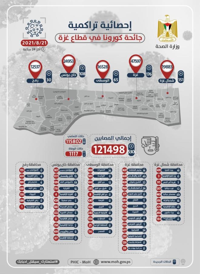 أعلنت وزارة الصحة في قطاع غزة، يوم السبت، عن تسجيل حالتي وفاة و530 اصابة جديدة بفيروس كورونا، خلال ال 24 ساعة الماضية.