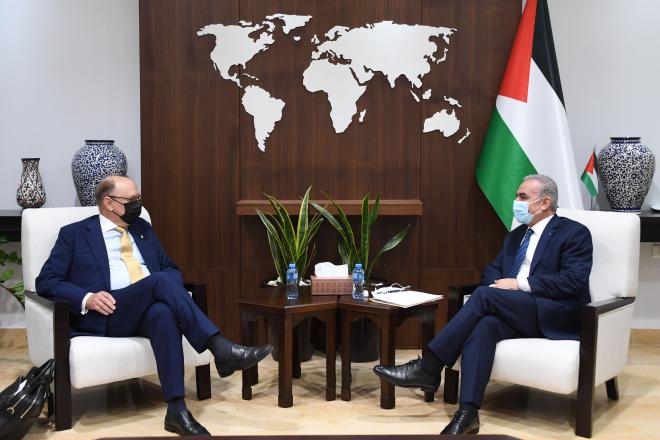 التقى رئيس الوزراء الفلسطيني محمد اشتية، يوم الثلاثاء في مكتبه برام الله، نائب وزير الخارجية السويدي روبيرت ريدبرغ، حيث اطلعه على آخر المستجدات السياسية، وبحث معه تعزيز التعاون المشترك بين البلدين على صعيد العديد من القطاعات.