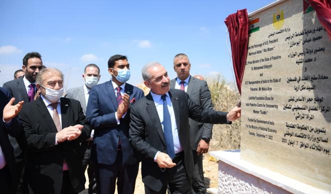 وضع رئيس الوزراء الفلسطيني محمد اشتية، يوم الثلاثاء، شمال رام الله، حجر الأساس لمركز تطوير المنتجات التراثية الفلسطينية "تراثي"، والممول من الحكومة الهندية.