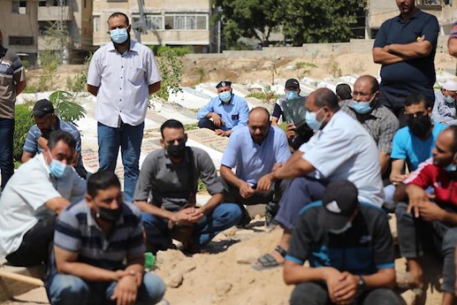 فلسطينيون يدفنون جثمان المواطنة زانة خطاب، توفت اثر اصابتها بفايروس كورونا، في دير البلح وسط قطاع غزة