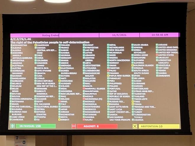 أجمعت اللجنة الثالثة التابعة للجمعية العامة للأمم المتحدة (لجنة الشؤون الاجتماعية والإنسانية والثقافية)، يوم الجمعة، على قرار حق تقرير المصير للشعب الفلسطيني، حيث صوتت 158 دولة لصالح القرار، و6 ضده (إسرائيل، جزر المارشال، ميكرونيزيا، ناورو، الولايات المتحدة، بالاو)، وامتنعت 10 دول عن التصويت.
