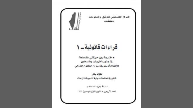 صدر العدد 40 من سلسلة «كراسات ملف»،(كانون الأول/ديسمبر ــ 2021)، ويحمل عنوان «قراءات قانونية ــ 1»، وهو محور جديد ضمن إصدارات المركز الفلسطيني للتوثيق والمعلومات ،«ملف». يتناول هذا المحور عدداً من القضايا المتصلة بمسار الصراع مع الإحتلال، من زاوية قراءتها وفق قرارات الشرعية الدولية وقواعد القانون الدولي، ذات الصلة.
