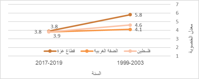 انخفض معدل الخصوبة الكلية خلال الفترة (2017-2019) إلى 4 مواليد، مقارنة مع 5 مواليد عام 1999؛ يذكر أن متوسط حجم الأسرة انخفض إلى 5 أفراد عام 2020 مقارنة بـ 6 افراد عام 2000؛ بواقع 5 أفراد في الضفة الغربية و6 أفراد في قطاع غزة.