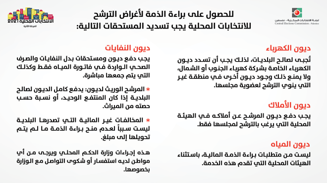 أُعلنت لجنة الانتخابات المركزية الفلسطينية إجراءات وزارة الحكم المحلي لكيفية حصول أي مرشح على براءة ذمة مالية من الهيئة المحلية التي ينوي الترشح لعضوية مجلسها، والذي قامت الوزارة بتعميه على مديريات الحكم المحلي والمجالس المحلية.