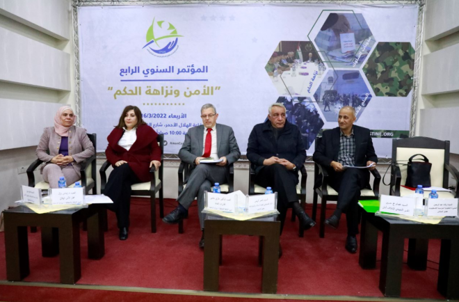 عقد المنتدى المدني لتعزيز الحكم الرشيد في قطاع الأمن الفلسطيني مؤتمره السنوي الرابع بعنوان "الأمن ونزاهة الحكم"، وذلك بمشاركة وزير الداخلية، وممثلين عن الأجهزة الأمنية وآخرين عن مؤسسات المجتمع المدني، وعدد من المؤسسات الحقوقية والإعلامية.