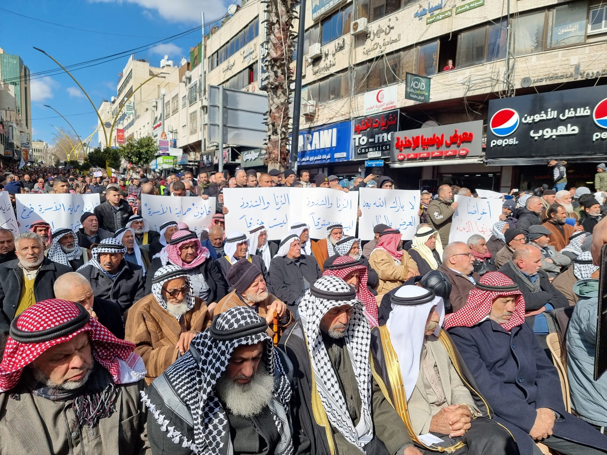 وتحدث الشيخ جبريل السراحنة ممثلا للمهجرين وأبناء المخيمات، مؤكدا "رفض قانون حماية الأسرة وأن رجال العشائر لن يقبلوا بهذا القانون ما بقي فينا نفس"، ومعتبرا ان" هذا القانون هو لتدمير الأسرة."