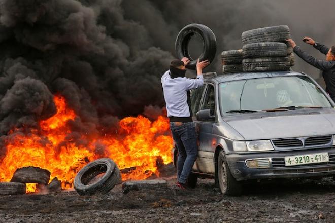 المتظاهرون الفلسطينيون يحرقون الإطارات خلال مواجهات مع جيش الاحتلال عقب المسيرة الأسبوعية ضد الاستيطان في قرية كفر قدوم