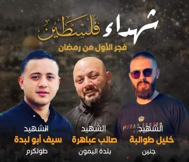 نعت الجبهة العربية الفلسطينية، الشهداء الثلاثة الذين "ارتقوا فجر الأول من رمضان بدم بارد على يد جيش الاحتلال على مفترق عرابة بجنين، مؤكدة أن جرائم القتل بحق شعبنا تكشف دموية الاحتلال وفاشيته، وتضاف إلى سجل جرائمه الأسود التي اقترفها بحق شعبنا، محملة المسؤولية الكاملة للاحتلال عن هذه الجريمة وما سيليها من احداث." كما قالت