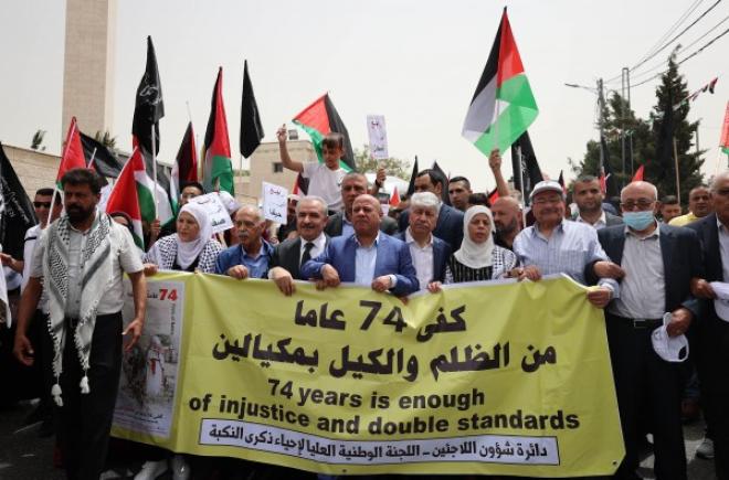 ومن جهته قال نائب رئيس حركة "فتح" محمود العالول "إن 74 عاما مرت من التشرد واللجوء والألم والمعاناة، ولكنها أيضا كانت سنوات من الصمود، والمقاومة، والإصرار على العودة والتمسك بالحقوق لاستعادة وطننا، والثقة بالانتصار، رغم كل المراهنات على موت الكبار ونسيان الصغار".