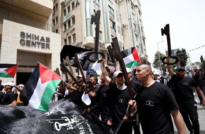 وأشار إلى أن خروج أبناء شعبنا اليوم في مسيرات حاشدة لإحياء الذكرى الـ 74 للنكبة في مختلف أماكن تواجده يؤكد تمسكه بحقه في العودة وإصراره على مواصلة كفاحه الوطني حتى إنهاء الاحتلال الإسرائيلي عن كل الأراضي الفلسطيني التي احتلت عام 1967.