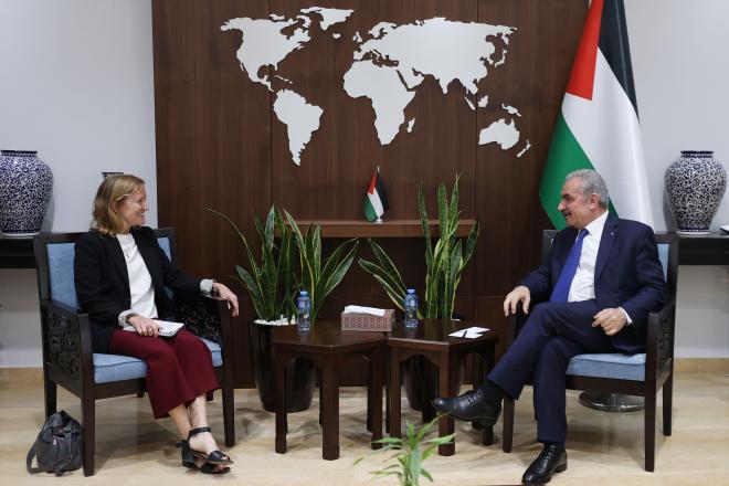 التقى رئيس الوزراء الفلسطيني د. محمد اشتية، يوم الخميس في مكتبه برام الله، مديرة بعثة الوكالة الأمريكية للتنمية الدولية للضفة الغربية وقطاع غزة (USAID) ألر جروبس.