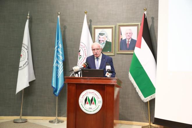 وثمن المالكي الجهود الوطنية المشتركة والمتعاونة التي خرجت بهذا الإنجاز الهام على مستوى البحث العلمي المحلي والعالمي، في هذا الصرح العلمي والإنساني والثقافي البارز المتمثل بالجامعة العربية الأمريكية، والتي تخطو خطوات متسارعة للنهوض بمسيرة التعليم والابتكار، وقال: "نحن وإياكم نفخر بأننا شعب متعلم، وواع، وأن التعليم والعلم والثقافة التي تميزت بها فلسطين قبل نكبة الشعب الفلسطيني، باعتبارها منارة العلم والثقافة، تستمر الآن بأجيالٍ وأنسالٍ لشعبنا المناضل الصلب."