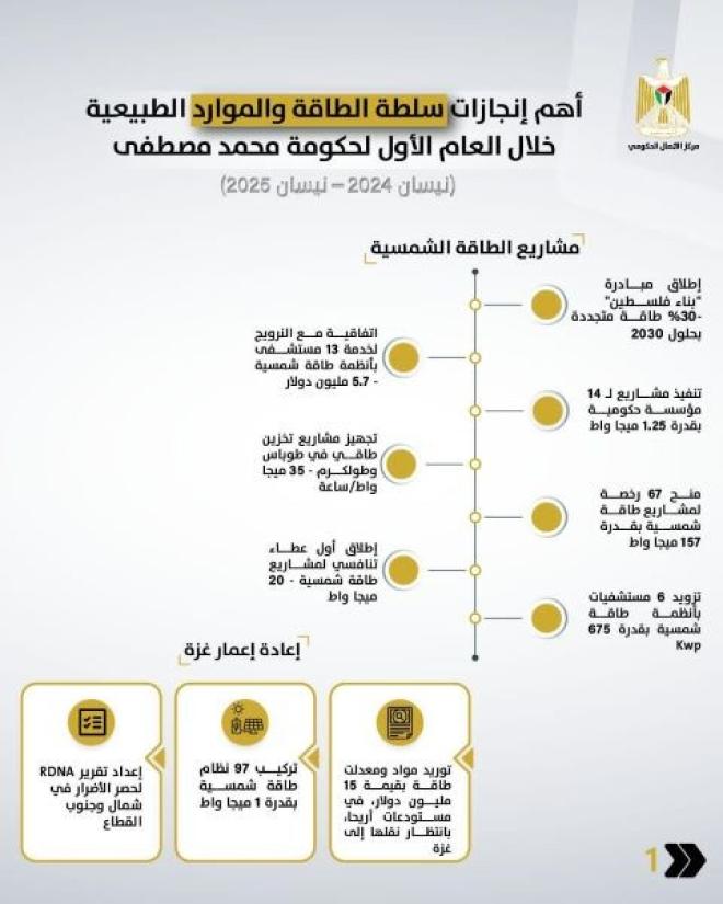 أصدر مركز الاتصال الحكومي تقريرًا يُلخص أبرز إنجازات سلطة الطاقة والموارد الطبيعية خلال العام الأول لحكومة محمد مصطفى (نيسان 2024 – نيسان 2025)، حيث شهد القطاع سلسلة من المشاريع التي تهدف إلى تطوير البنية التحتية للطاقة، وتعزيز الاعتماد على المصادر المتجددة، وزيادة الكفاءة، في إطار رؤية وطنية للتحول الطاقي المستدام.