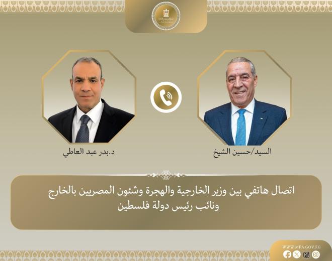 أجرى وزير الخارجية والهجرة وشؤون المصريين بالخارج، د. بدر عبد العاطي، اتصالًا هاتفيًا مع نائب رئيس دولة فلسطين حسين الشيخ، في إطار التنسيق والتشاور المستمرين حول مستجدات الملف الفلسطيني وجهود تثبيت «اتفاق شرم الشيخ للسلام» وضمان تنفيذه.