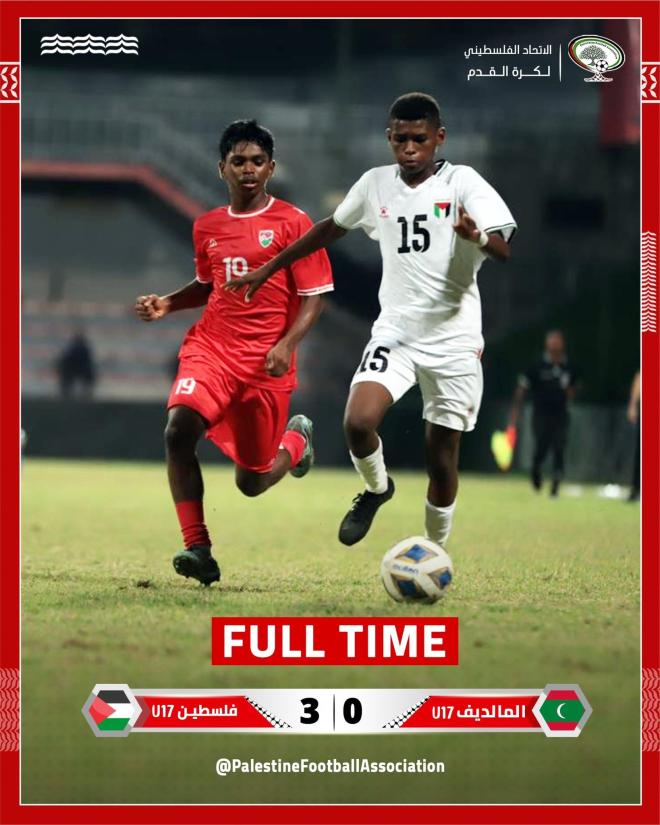 حقق منتخب فلسطين للناشئين، مساء السبت، انتصارا كبيرا على ضيفه منتخب جزر المالديف بثلاثية نظيفة في لقاء ودي جمعهما في العاصمة ماليه، ضمن الاستعدادات لتصفيات كأس آسيا تحت 17 عاما.