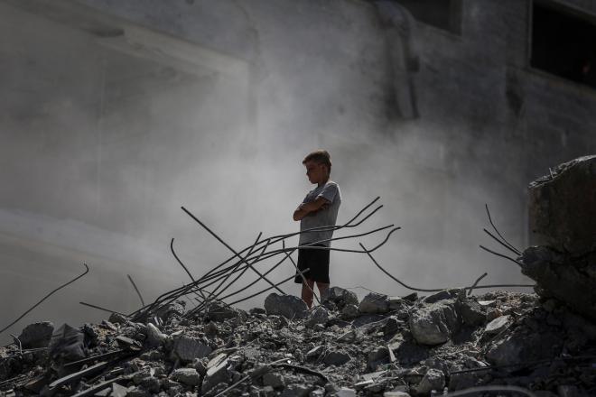 ولا يتمكّن إياد ريان (55 عاما) من حبس دموعه وهو يشير الى مكان وجود جثة زوجته وطفليه تحت أنقاض منزلهم المدمّر في غرب غزة.