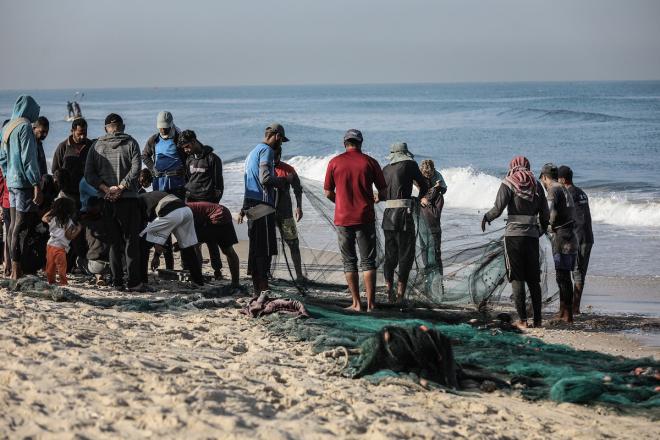 صيادون فلسطينيون نازحون يجمعون صيدهم من الشباك التي جلبوها إلى الشاطئ في دير البلح، في وسط قطاع غزة، في 20 نوفمبر/تشرين الثاني 2025.